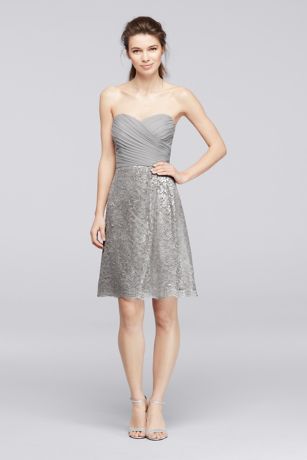 View david's bridal collection of silver grey bridesmaid dresses in long & short styles.