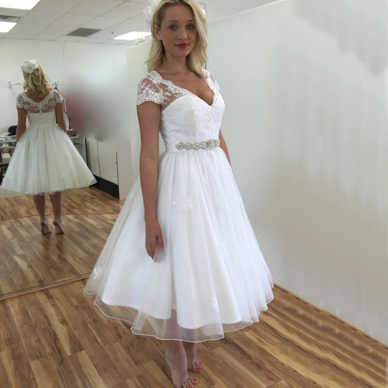 Satonoaki vintage lace tea length short wedding dresses sleeves see through v neck wedding bridal gowns vestido de novia. Shop tea wedding dresses in vintage & 1950s styles. Real bride, naomi, in her mooshki sarah lace tea length wedding dress with sleeves. Wholesale mermaid wedding dresses, simple wedding dresses and bridal on dhgate.com are fashion and cheap. Floral tea length wedding dresses.
